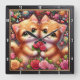 This adorable square wall clock features a heartwarming digital illustration of two fluffy ginger kittens nestled together. The kittens have large, expressive green eyes and are shown holding a small bouquet of pink roses. They are surrounded by a lush, vibrant garden of multi-colored roses in shades of red, pink, and yellow, accented by whimsical floating hearts and sparkling floral patterns. The artwork is framed by a modern black wood-textured border with bold white numeric markers for easy timekeeping. This functional piece of home decor combines high-quality whimsical art with practical utility, making it a perfect gift for cat lovers, Valentine Day, or as a charming addition to a child nursery or playroom. The rich, warm color palette and sweet character design provide a cheerful focal point for any room.