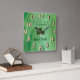 Relógio de parede de acrílico quadrado personalizável de 10,75" x 10,75" com uma imagem de vidro verde manchado, uma pedra de shamrock cortada a ouro e uma face de relógio de ouro. Dica: Para acentuar a beleza deste relógio, pintar as mãos de ouro. Veja a Rua inteira. A coleção do relógio do dia de Patrick no DÉCOR| Seção Relógios.