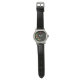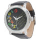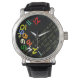 Um relógio conceitual com números de cor bagunçados e o texto "que horas são?" - você pode editar o design e mudar a cor de fundo preto