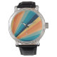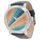 Ilustração geométrica de raios solares de estilo retrô com listras amarelas, laranja, azuis e turquesas