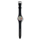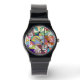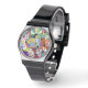 Este relógio tem um desenho abstrato que é feito de nove quadrados com um círculo e "raios" saindo do círculo em muitas cores diferentes.