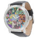 Este relógio masculino tem um desenho abstrato que é feito de nove quadrados com um círculo e "raios" saindo do círculo em muitas cores diferentes.