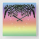 Árvore, em preto com tom de verde, atingindo de cantos superiores sobre os algarismos brancos da face do relógio. O plano de fundo é a faixa das cores do arco-íris que se somam através do roxo azul, rosa, vermelha, laranja, amarela e verde, de cima para baixo.