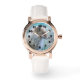 Um relógio com uma foto de uma raposa fofa sozinha. Colocado sobre um fundo azul de inclinação.