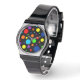 Um padrão ousado com pontos irregulares do arco-íris a preto.
