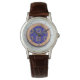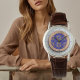 Este belo relógio é elegantemente decorado com um sutil padrão geométrico de madeira talhada e gravada num círculo central. O fundo do círculo em azul real está melhorando a muito fina camada de cadarço e está rodeado por uma coroa de madeira. Você pode personalizar uma impressão muito delicada de suas iniciais escrita em uma fonte azul refinada na parte inferior da coroa. Um jogo sutil de sombra/luz dá a ilusão de que a peça central deste relógio está em alivio. O fundo principal permanece branco e exibe pequenas marcas azuis finas para os números de hora.