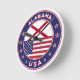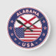 Crachá do Alabama com bandeira do Alabama e bandeira dos EUA, cores, forma arredondada. Emblema do Alabama. Selo do Alabama. Coleção dos Estados Unidos.