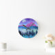 Uma paisagem de abstrato com cores e texturas únicas mostrando uma cena de montanha com árvores e neblina névoa em tons de roxo, azul, lacre e ciano.