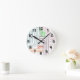 Este relógio de parede tem um design de arte deco de linhas em roxo, rosa, laranja e azul.