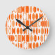 Este relógio tem um design de arte feito de ovais e meio ovais em branco e tons de laranja.