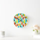 Este relógio tem um design moderno do século médio de longas ovais em amarelo, laranja, verde e turquesa com linhas pretas com círculos nas extremidades.