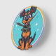 Ilustração admirável no estilo cartoon de um filhote preto e marrom feliz vestindo um colar azul e sentado sobre um fundo colorido. Perfeito para designs alegres, temas infantis e projetos relacionados com animais.
