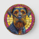 Retrato de um cão com uma barba espessa, espessa e olhos expressivos, enquadrado por um fundo vívido, colorido, em tons amarelos, rosa e azuis.