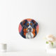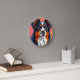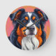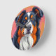 Uma ilustração digital deslumbrante apresentando um cão tricolor com pelo preto, branco e laranja contra um fundo vibrante.