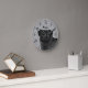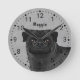 A ilustração original do desenho de Destei de uma linda cabeça de cão da raça Pug, casaco preto. A cor de fundo é cinza com textura decorativa. A textura pode ser removida e a cor de fundo pode ser alterada para qualquer outra cor, se desejado. As horas são marcadas com números. As horas e os minutos são mostrados com uma face pontilhada do relógio. Há também uma área de texto personalizável para um nome ou outro texto personalizado.