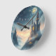 Uma cena mágica e encantadora de um grande castelo erguido sobre um pico de montanha suave sob um céu noturno estrelado. Uma lua grande e luminosa domina o céu, adornada com uma explosão de estrelas radiante. Corpos celestes espumantes e poeira cósmica giratória enchem a extensão escura acima das nuvens etéreas moles que mantem a paisagem abaixo. O castelo apresenta torres altas, janelas brilhantes e detalhes arquitetônicos complexos, iluminados pela lua e pistas da luz interna. Formações de rochas jagadas subem em primeiro plano, somando à atmosfera mística desse reino fantástico.