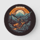 Ciclismo Vida, retrorreflecção em laranja e azul de um ciclista andando pelas montanhas e pela floresta com o sol ao fundo
