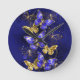 Composição de borboletas luxuosas de safira e joias de ouro sobre fundo texturizado a azul.