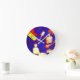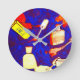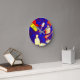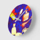 O colorido relógio azul real para um compro de beleza ou salão de unhas apresenta garrafas de pincéis e esmalte de unhas, alguns derramando lindos tons de cor. Parece que alguém está fazendo muitos testes de cores. Da arte original acrílica de Mary Hamilton.