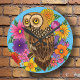 Coruja sentada entre um buquê de flores coloridas de verão num pano de fundo azul