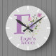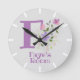 Crianças, Relógio De Quarto. Design apresenta Monograma & Nome com Flores em ambos os lados no estilo pastel de cor de água. O nome de exemplo é Faye. Altere o nome conforme desejado para qualquer pessoa com um nome que comece com F.