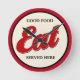 Trendy chic retro cozinha wall clock em uma comida temedora jogar de volta design que tem a frase Boa Comida Servida Aqui estilizada em um olhar ousado, mas estilizado. Projetado como uma peça do tempo de decoração da parede da cozinha que adiciona um toque de talento à decoração da sua casa. Criado para a casa ou adicione isto à parede do restaurante para adicionar atmosfera.