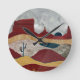 Uma paisagem abstrato com cores e texturas únicas mostrando uma cena do deserto com um sol azul ascensão e um cacto em tons de vermelho, cinza, bege e azul.