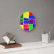 Este relógio de parede tem uma design de Bauhaus de retângulos divididos em pedaços cada vez menores em vermelho, amarelo, azul, verde, roxo num campo de branco.