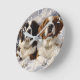A imagem mostra dois cães Bernard Santos deitados em uma paisagem nevada. O cão à esquerda tem pelo preto e marrom, enquanto o cão à direita tem pelo castanho e branco. Ambos os cães têm marcas brancas no peito e nas patas. Eles estão olhando diretamente para o espectador, com o cachorro à direita esticando a língua. O fundo apresenta uma serra nevada e uma floresta de pinheiros. Presente perfeito para a rua do cão Bernard.