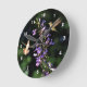 Dois belos beija-flores voando com o relógio das flores roxas na parede