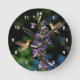 Dois belos beija-flores voando com o relógio de flores roxas na parede