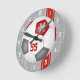 Esta equipe desportiva colore relógio temático do futebol para uma menina ou um menino apresenta um gráfico simples de bola de futebol sobre o qual você pode personalizar o nome do atleta, o monograma e o número de camisa - os painéis pretos da bola de futebol foram recoloridos de vermelho e cinzas - o fundo é uma cinza de luz personalizável com o gráfico de acento líquido de gol, listras vermelhas verticais e algarismos brancos do relógio_zynes