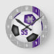 Esta equipe desportiva colore relógio temático do futebol para uma menina ou um menino apresenta um gráfico simples de bola de futebol sobre o qual você pode personalizar o nome do atleta, o monograma e o número de camisa - alguns dos painéis pretos da bola de futebol foram recoloridos roxos - o fundo é uma cinza leve personalizável com o gráfico de acento líquido de gol, faixas verticais de varanda roxas e números de relógio branco d_zynes