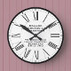 Um relógio de parede para um escritório ou uma empresa privada. O relógio tem o nome da empresa e também o endereço. Números atraentes no estilo romano e um fundo branco limpo.