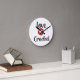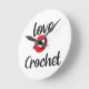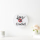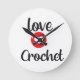 Relógio projetado para uma pessoa que ama crochê. Relógio branco redondo com letras negras e vermelhas "Love 2 Crochet". Decorre seu escritório ou sala de artesanatos.
