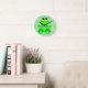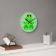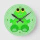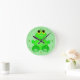 Relógios de parede fofos para crianças com um gráfico de desenho animado de uma rã verde fofa em um fundo listrado verde. Esses relógios temáticos de rãs seriam perfeitos pendurados no quarto de uma criança ou numa creche.