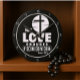 An impactful art piece featuring the words HIS LOVE ENDURES FOREVER in white lettering on a black background, accompanied by a cross and Psalm 136:1. The design includes a bold white cross within a circular emblem, emphasizing the spiritual message. A powerful item perfect for expressing faith and devotion.