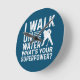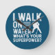 O relógio do jogador de hóquei com um ditado humorístico mostra um texto branco sobre fundo azul e um jogador branco de hóquei em silhueta. O texto deste relógio de jogador de hóquei diz que eu venho na água. Qual é a sua superpotência?