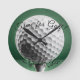 Relógio de parede com uma imagem de bola de golfe em uma tenda em frente a um fundo verde, e as palavras "É hora de golfe!"