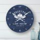 Este relógio personalizado da família rústica do lago apresenta uma cabana ao lado do lago aninhada na base dos pinheiros, sobre um fundo de madeira azul marinho, com nome da família e localização da casa do lago.