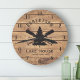 Este relógio rústico personalizado de nome familiar lake house wall apresenta um pinheiro em remos cruzados sobre um fundo de madeira marrom.