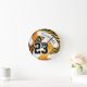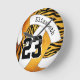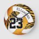 Este relógio da parede de vôlei da zebra selvagem mostra um padrão de sotaque ousado em zebra que listra quatro dos painéis de vôlei - os painéis de stripes de zebra mais três outros painéis têm um fundo laranja/ouro que contrasta com os restantes painéis de vôlei - personalize com o nome do jogador e o número de jersey - de katz_d_zynes