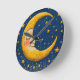Lua crescente caprichosa com um rosto sorridente. A lua é pintada em uma cor dourada brilhante, adornada com espirais decorativas. Seus olhos estão fechados, dando-lhe uma expressão serena, complementada por bochechas rosadas. Ao redor da lua, há numerosas estrelas de diferentes tamanhos, todas colocadas contra um céu noturno azul profundo. Abaixo, há delicadas linhas onduladas que sugerem grama ou folhagem, realçando a qualidade encantadora e sonhadora da cena. O clima geral é alegre e mágico, evocando um senso de admiração.