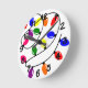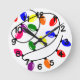 Este relógio de parede tem uma design de Natal de luzes enredadas em vermelho, azul, amarelo, verde, rosa e roxo.