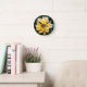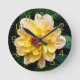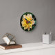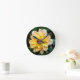 Este relógio encantador com uma fotografia de uma flor coberta de orvalho fresco matinal seria fantástico em qualquer casa. Pequenas e brilhantes pétalas de cor amarela sobre um fundo verde rico com uma profunda jante de ouro, números e minutos fazem com que esta imagem se destaque.