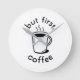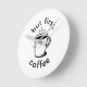 Um café quente numa caneca com a citação "Mas primeiro café".