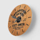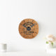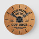 "Meça duas vezes, corte uma vez, libra no lugar, preencha lacunas, maldição, punch e chute," relógios de parede. Texto, com uma lâmina circular parece que está cortada de madeira. Também em t-shirts, suores, posters, canecas, emblema novidade da loja Zazzle da KBilltv.