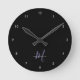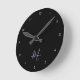 Relógio redondo do Elegante Modern Black Lavanda Script Monograma. Um monograma elegante de script de Lavanda combinado com uma fonte branca san-serif limpa permite uma aparência contemporânea.