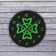 A imagem é meu desenho original de um nó celta verde. O verde é vibrante contra um fundo preto. Veja minha arte da loja daqui até março para produtos de harmonização com este design.
