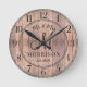 Um relógio de parede de casamento rústico moderno em madeira de celeiro com data de estabelecimento e nome dos noivos.